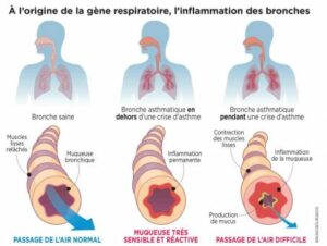 Ces symptômes sont causés par une inflammation chronique des voies respiratoires, qui rend les bronches hypersensibles et réactives à certains déclencheurs, tels que les allergènes, les irritants, les infections respiratoires et l’exercice physique.