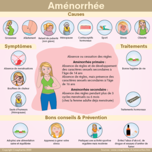 L’aménorrhée est l’absence de menstruations chez une femme en âge de procréer. Elle peut être primaire, c’est-à-dire que la femme n’a jamais eu ses règles, ou secondaire, c’est-à-dire que la femme a cessé d’avoir ses règles pendant au moins trois cycles menstruels consécutifs.