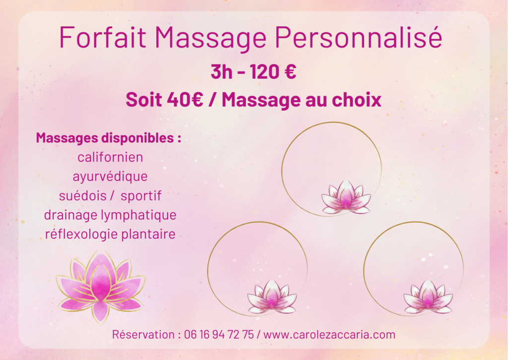 Pour seulement 120€, vous bénéficiez de 3 heures complètes de soins, ce qui revient à seulement 40€ par massage au choix.