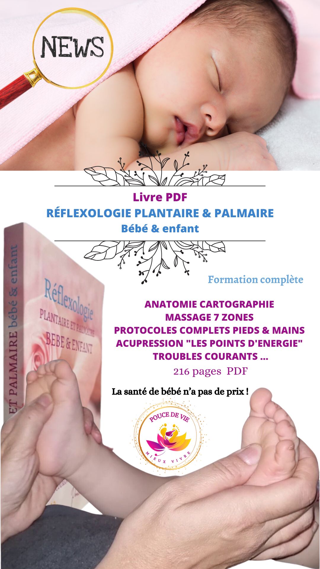 Découvrez ce livre qui est une formation complète de réflexologie plantaire et palmaire pour bébé et enfant. Inclus : anatomie, cartographie, protocoles de massage pour pieds et mains, acupression et points d’énergie.